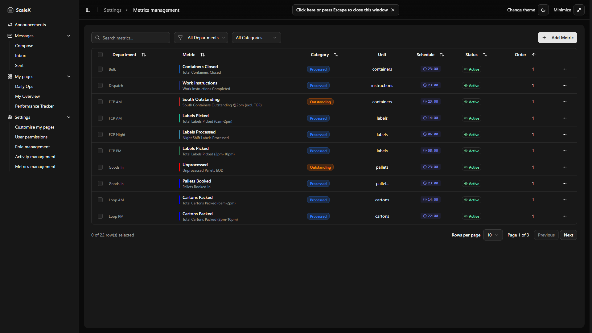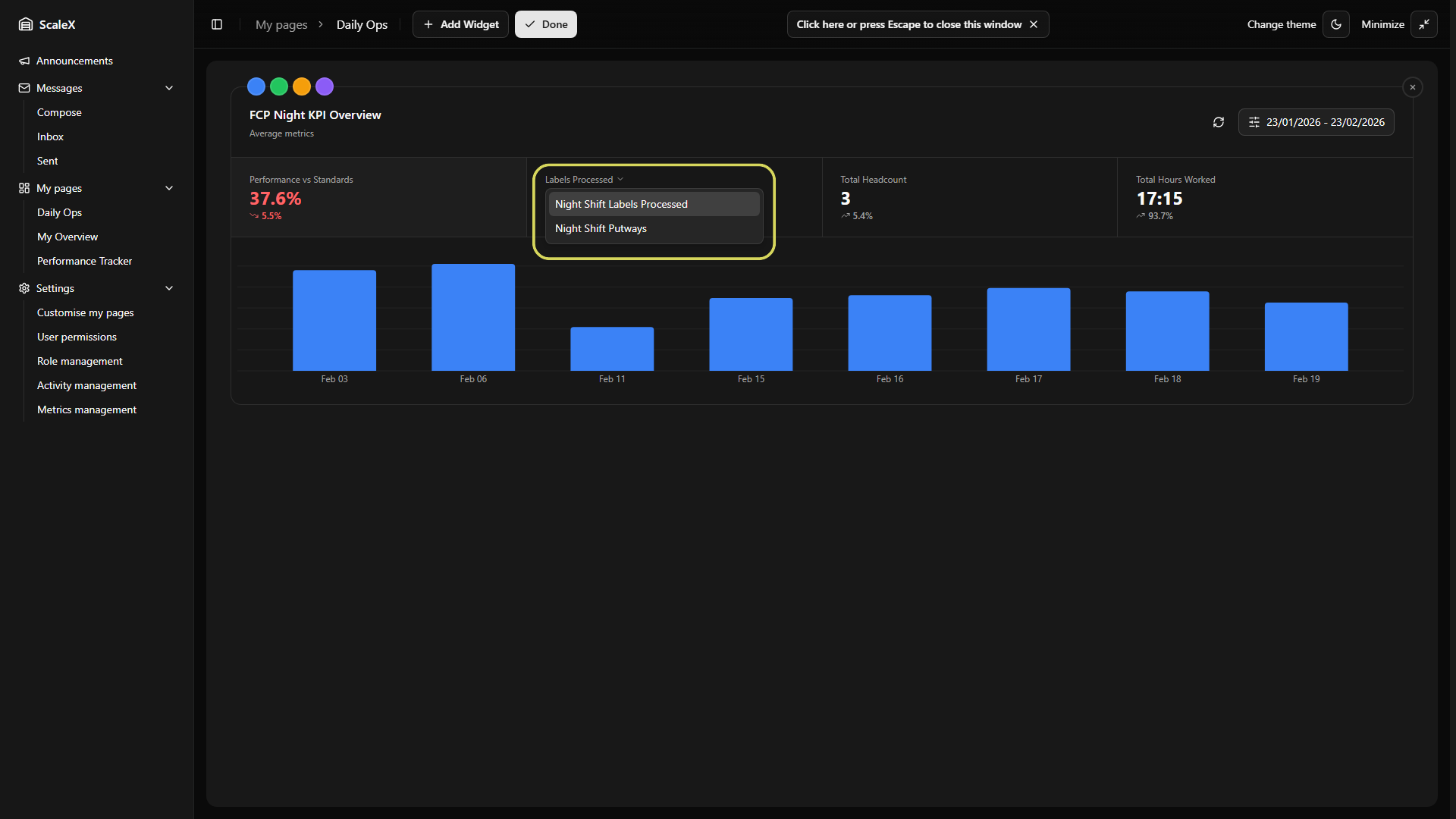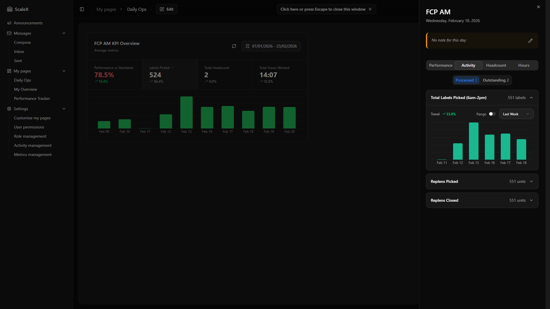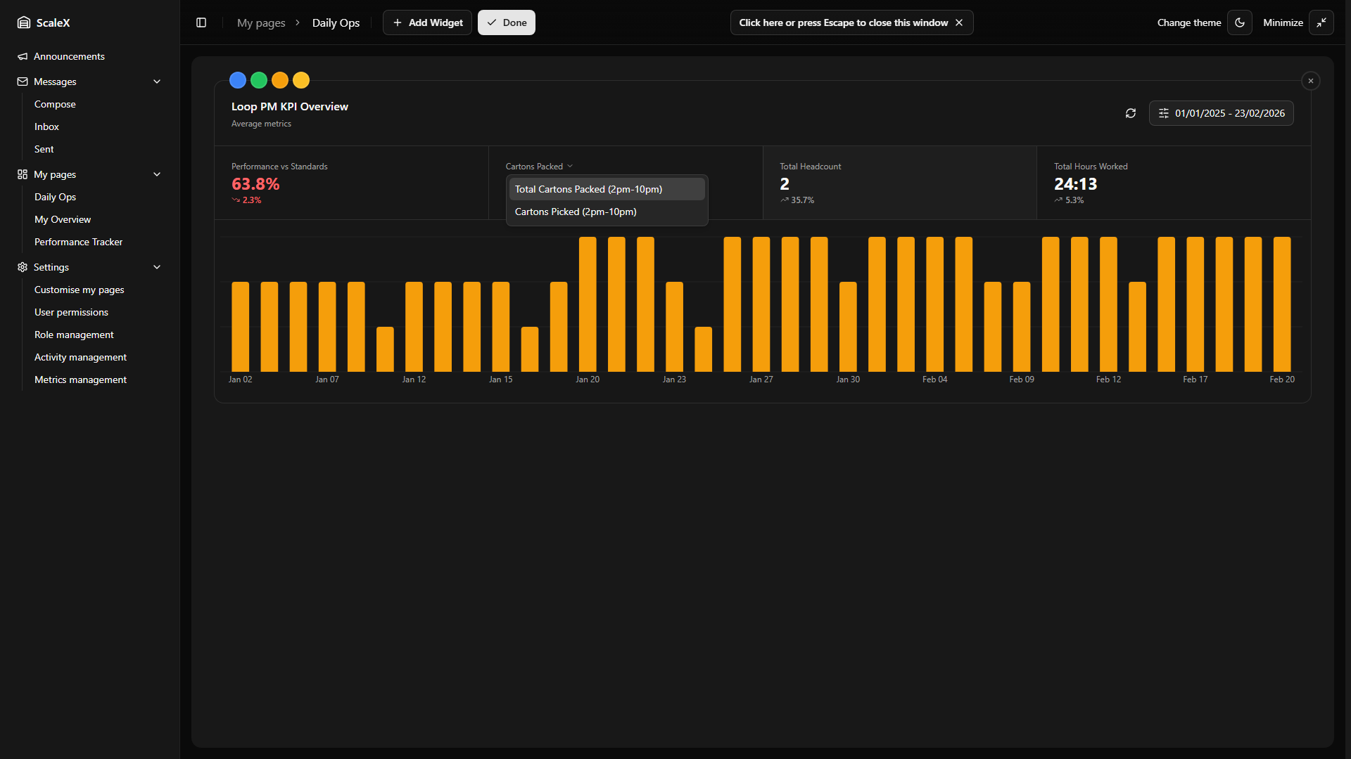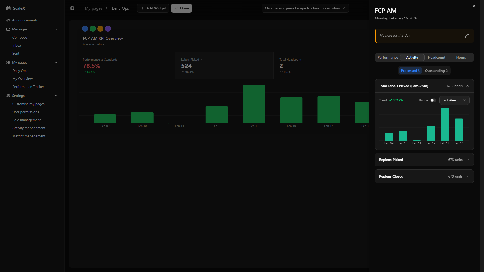 ScaleX extends Manhattan Scale WMS with customisable dashboards, KPI tracking, announcements, internal messaging, and granular permission management — all embedded directly within the Manhattan interface.