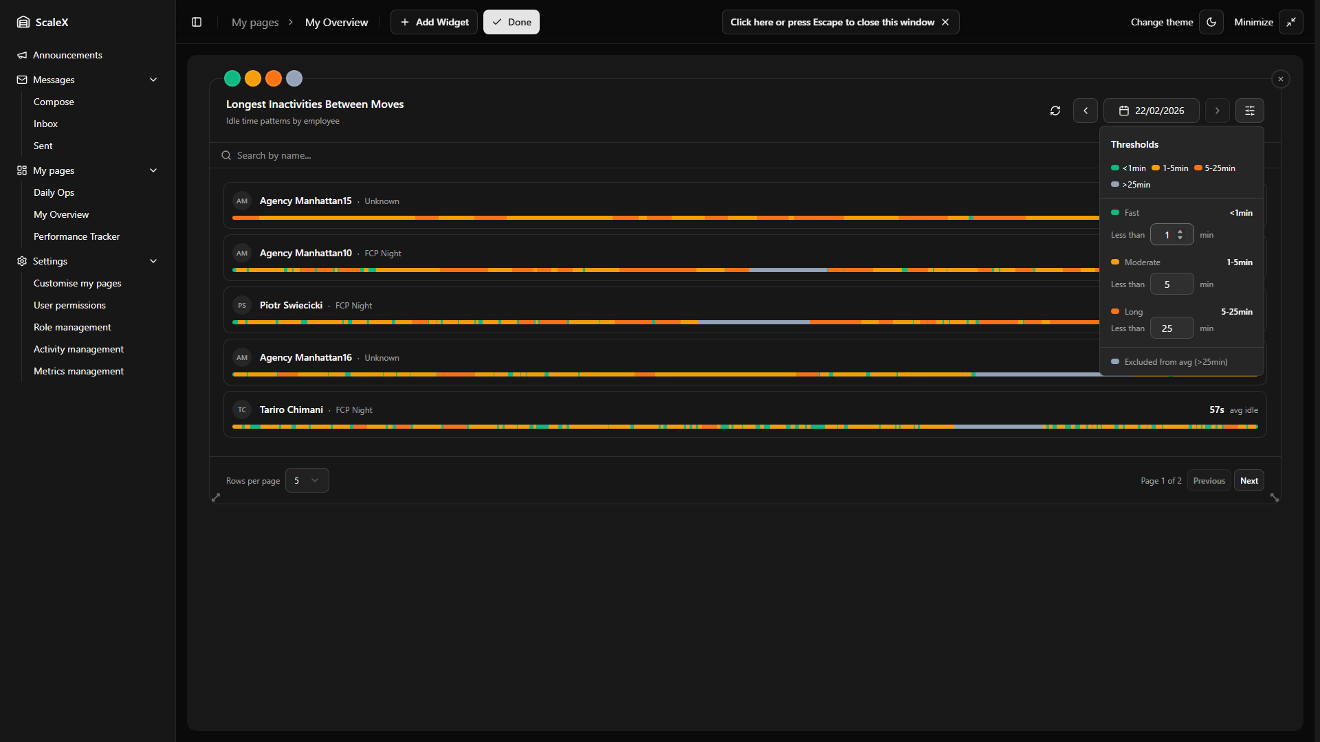 Customisable dashboard pages with drag-and-drop widget layout.