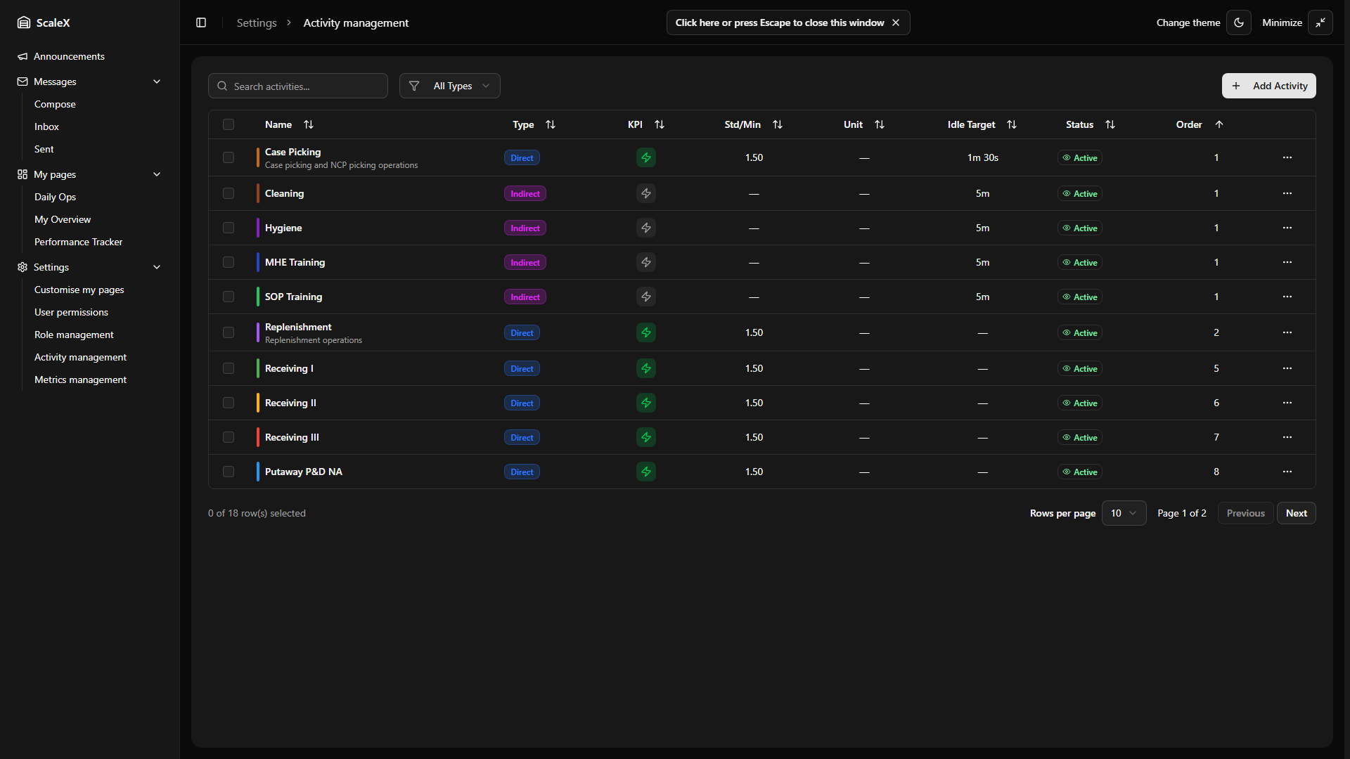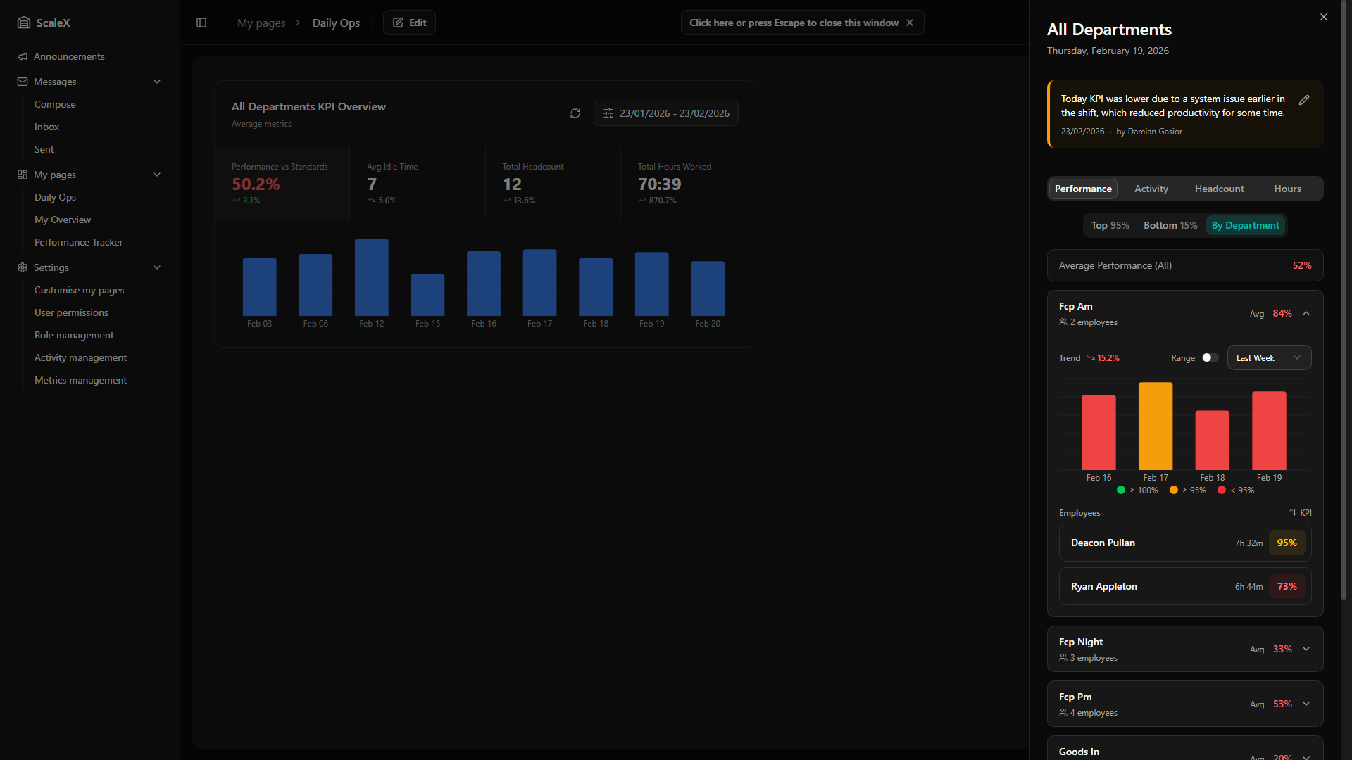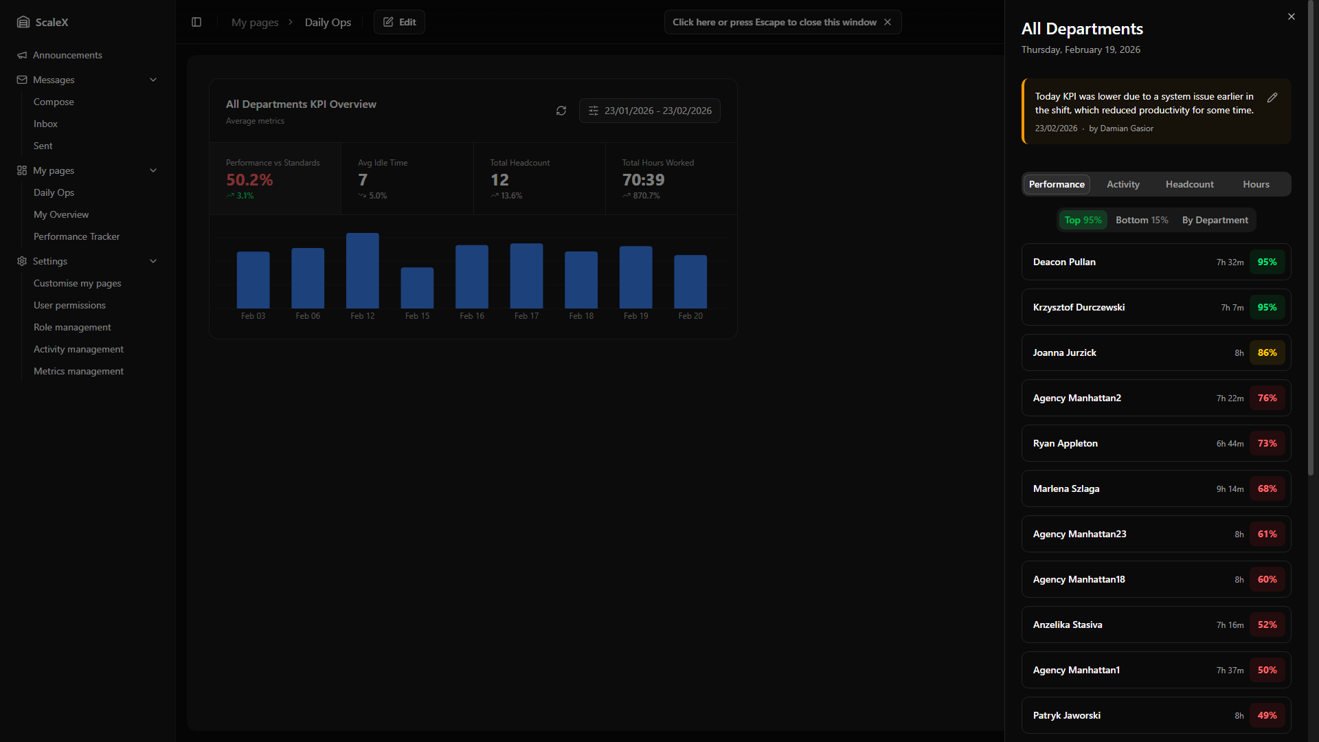 ScaleX extends Manhattan Scale WMS with customisable dashboards, KPI tracking, announcements, internal messaging, and granular permission management — all embedded directly within the Manhattan interface.