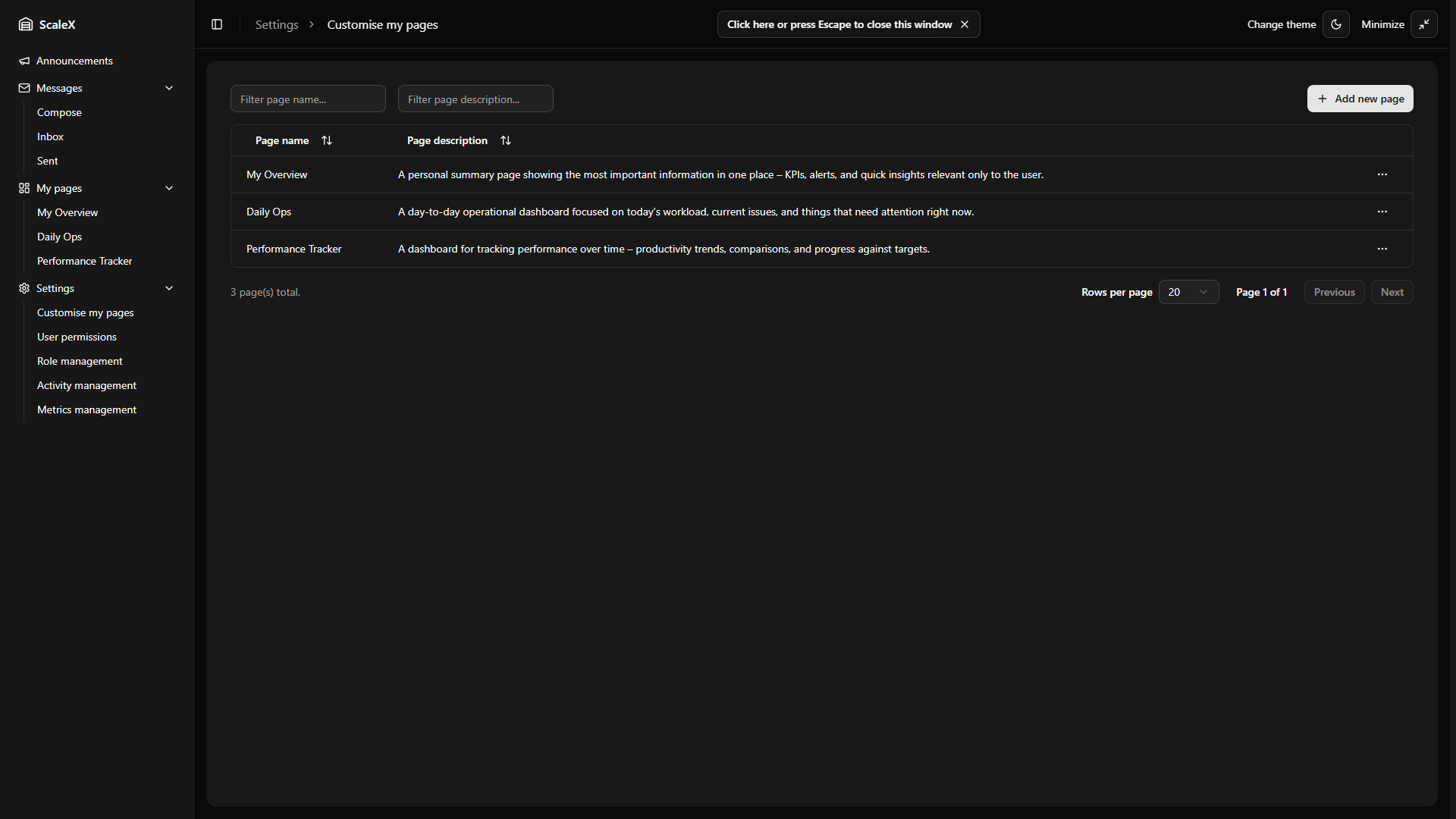 - Settings → Customise My Pages — a dedicated management view where users create, rename, edit descriptions, and delete pages.