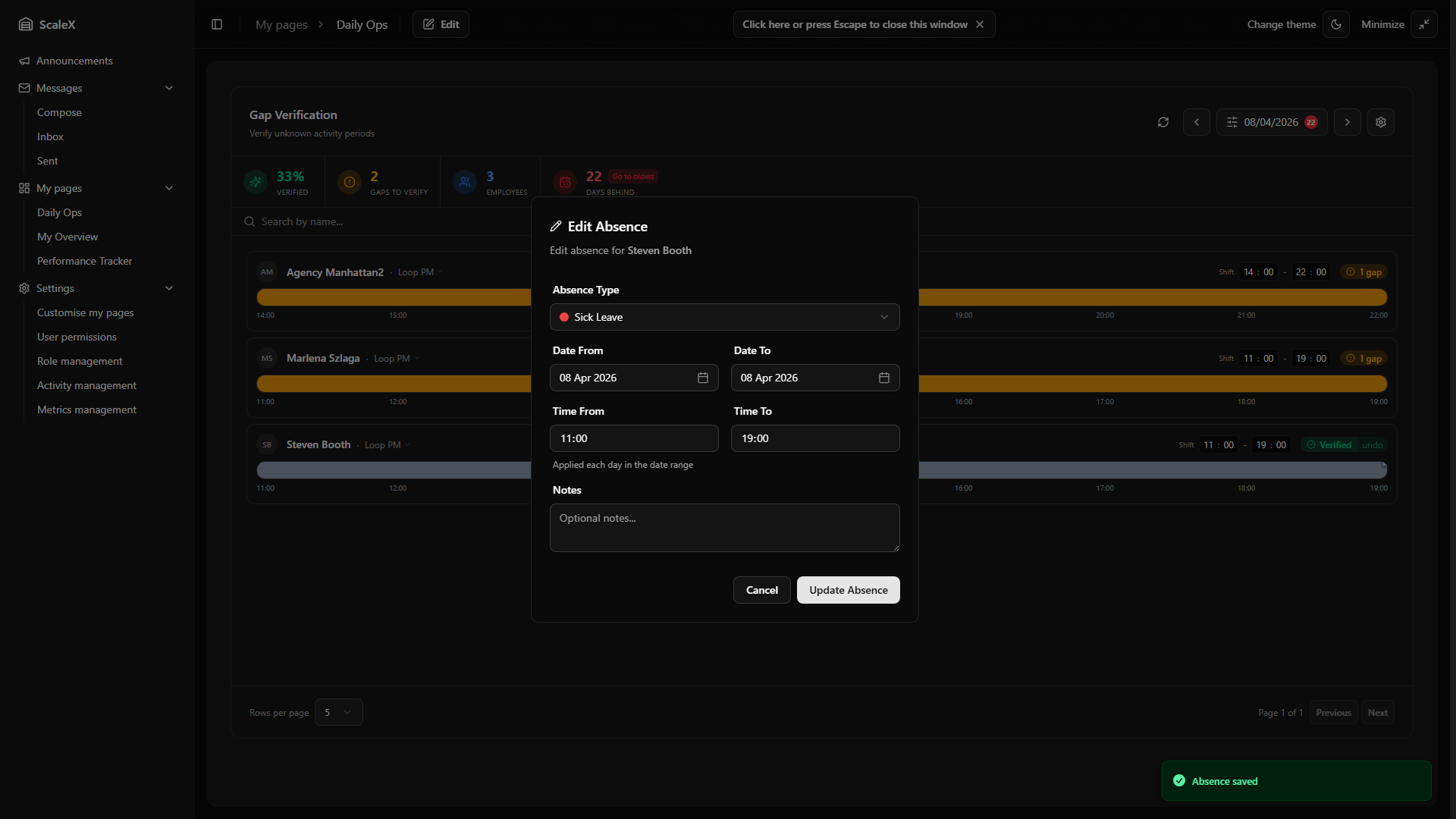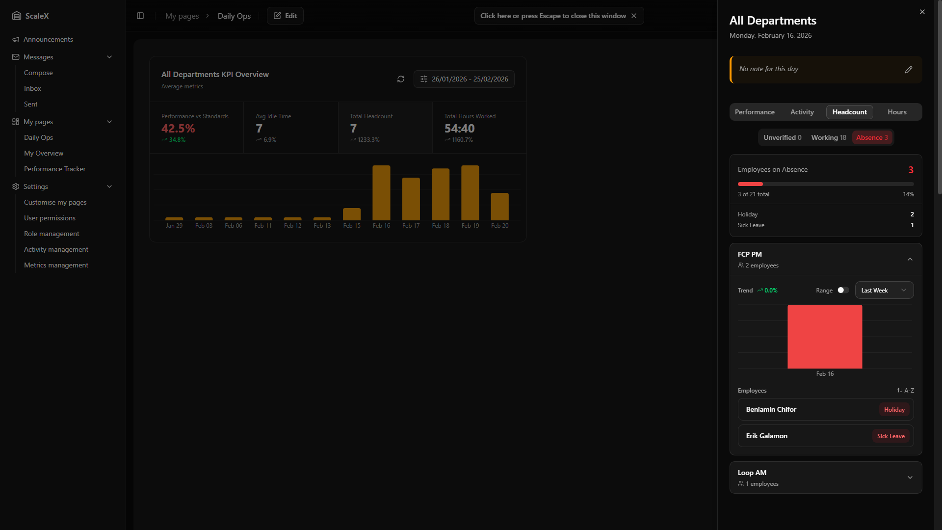 - Per-employee absence type — within each department card, every employee row now displays a badge with their specific absence type (Holiday, Sick Leave, etc.), so leaders can see at a glance why each person is absent.