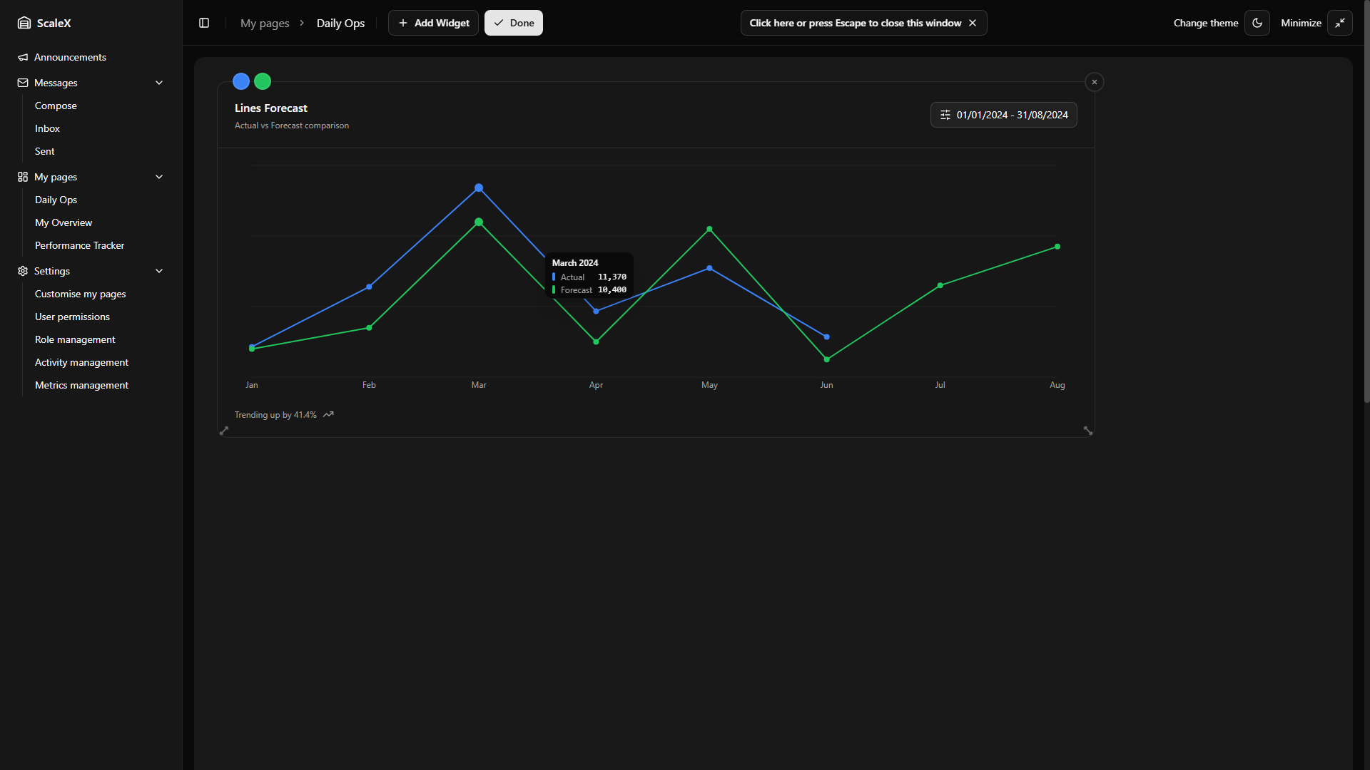 Customisable dashboard pages with drag-and-drop widget layout.