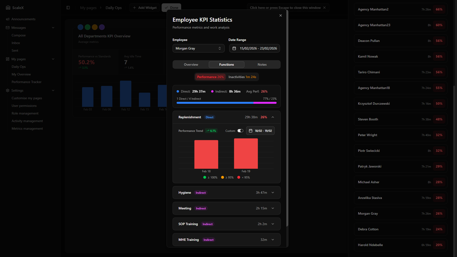 Performance percentages are colour-coded throughout the application to give an instant visual indication of how employees or departments are performing. The default thresholds are: