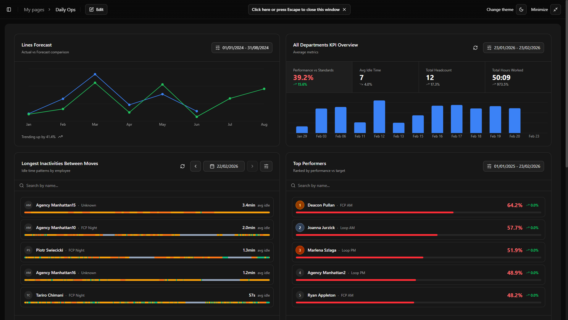 Added a department dropdown to the Longest Inactivities widget header, allowing leaders to filter the employee ranking by a specific department or view all departments at once.